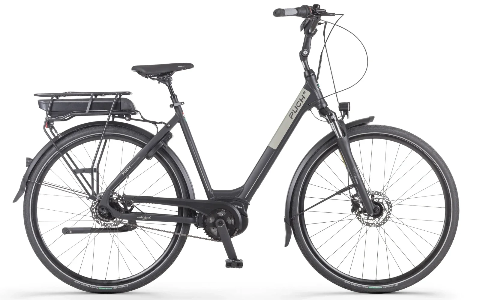De PUCH E-Symphony is een zeer comfortabele ebike met motor in het midden. Deze ebike is voorzien van een BOSCH middenmotor, namelijk de Active Line 3. Hij is standaard voorzien van een 400Wh accu, wat u tussen de +/- 70 en 100 km aan bereik biedt. Er is een luxe LCD display voorzien van Bosch, namelijk de Intuvia, met 5 ondersteuningsstanden. De E-Symphony heeft 7 versnellingen en zowel voor als achter voorzien van Shimano MT200 hydraulische schijfremmen. Verder is de ebike zowel voor op de voorvork als op de zadelpen geveerd. Hij is te bestellen in een 49 cm en 53 cm framemaat, dit in de kleuren Matt Black en Stormey Grey Glossy.